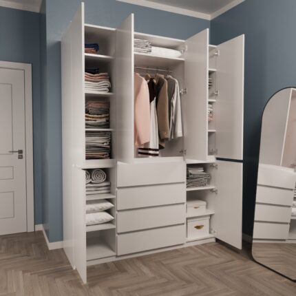 Просторна шафа, що не обмежує Вас в розмірах речей. В ній прибрані всі перегородки та інші деталі, щоб відкрити максимальний доступ до речей, щоб вони були завжди під рукою.