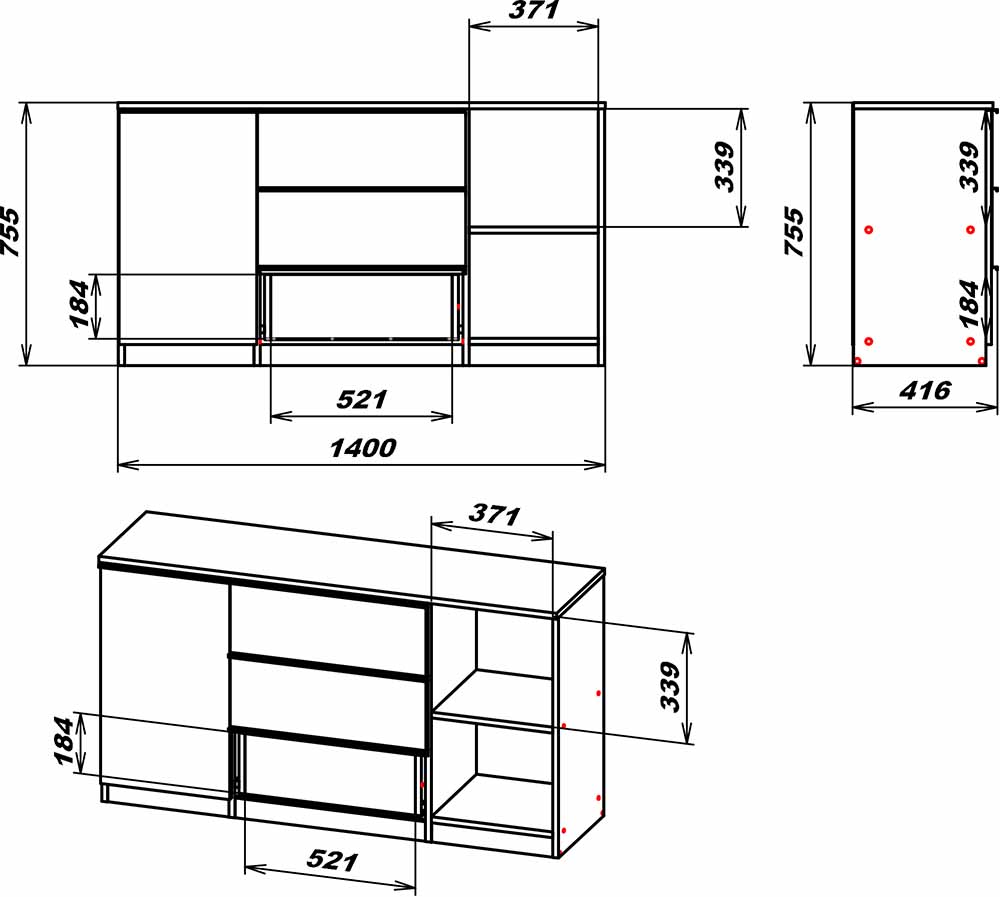 Розміри:(В/Ш/Г) : 755/1400/416мм
