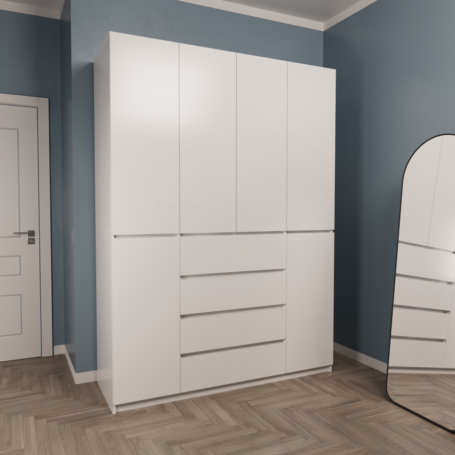 Шафа з значною кількістю поличок, шухляд та штангою для одягу, що розміщена в середині шафи. Велика кількість дверей дозволить зручно зонувати речі, а дизайн без ручок чудово підкреслить мінімалістичний стиль даної шафи, та виглядатиме гарно в будь-якому інтер’єрі.