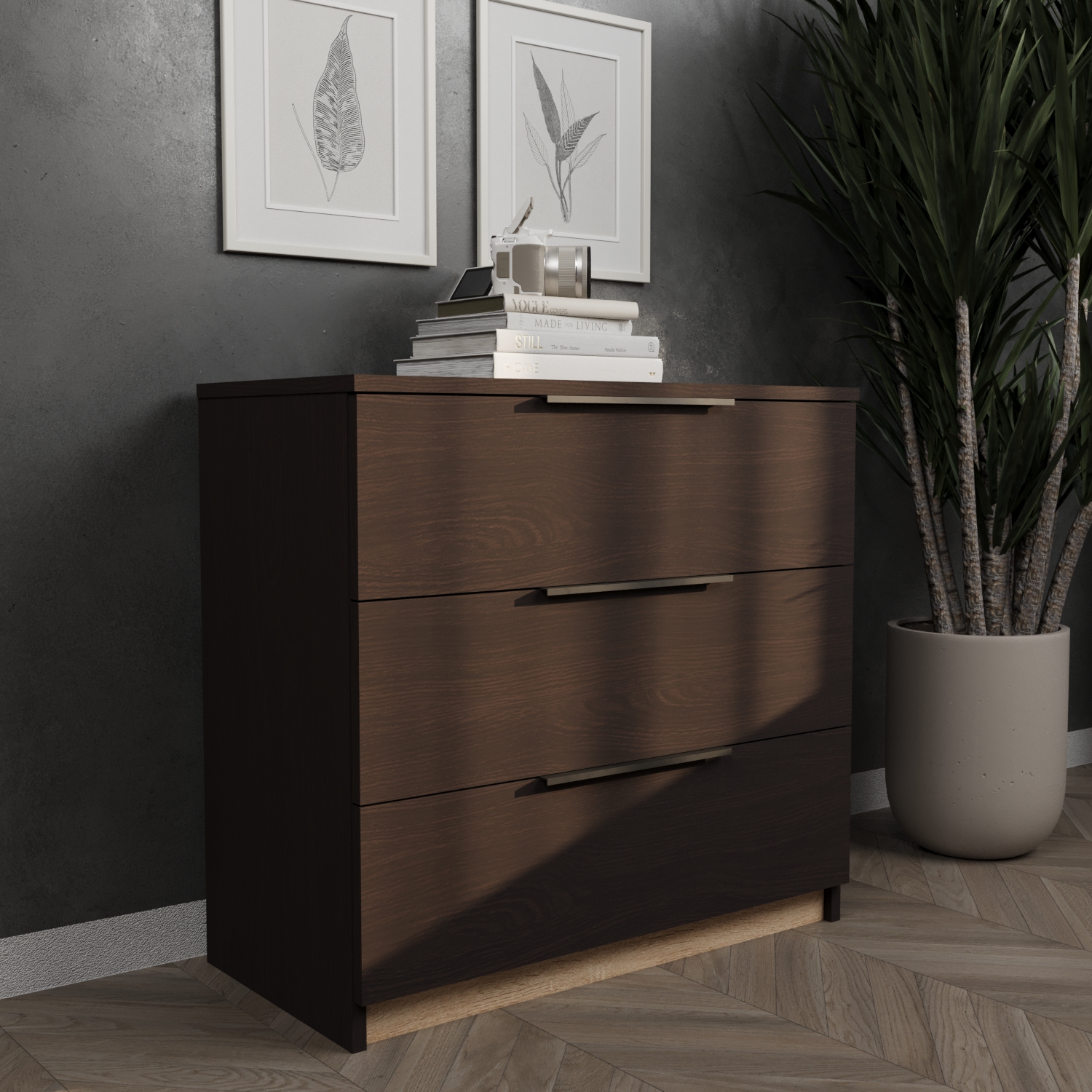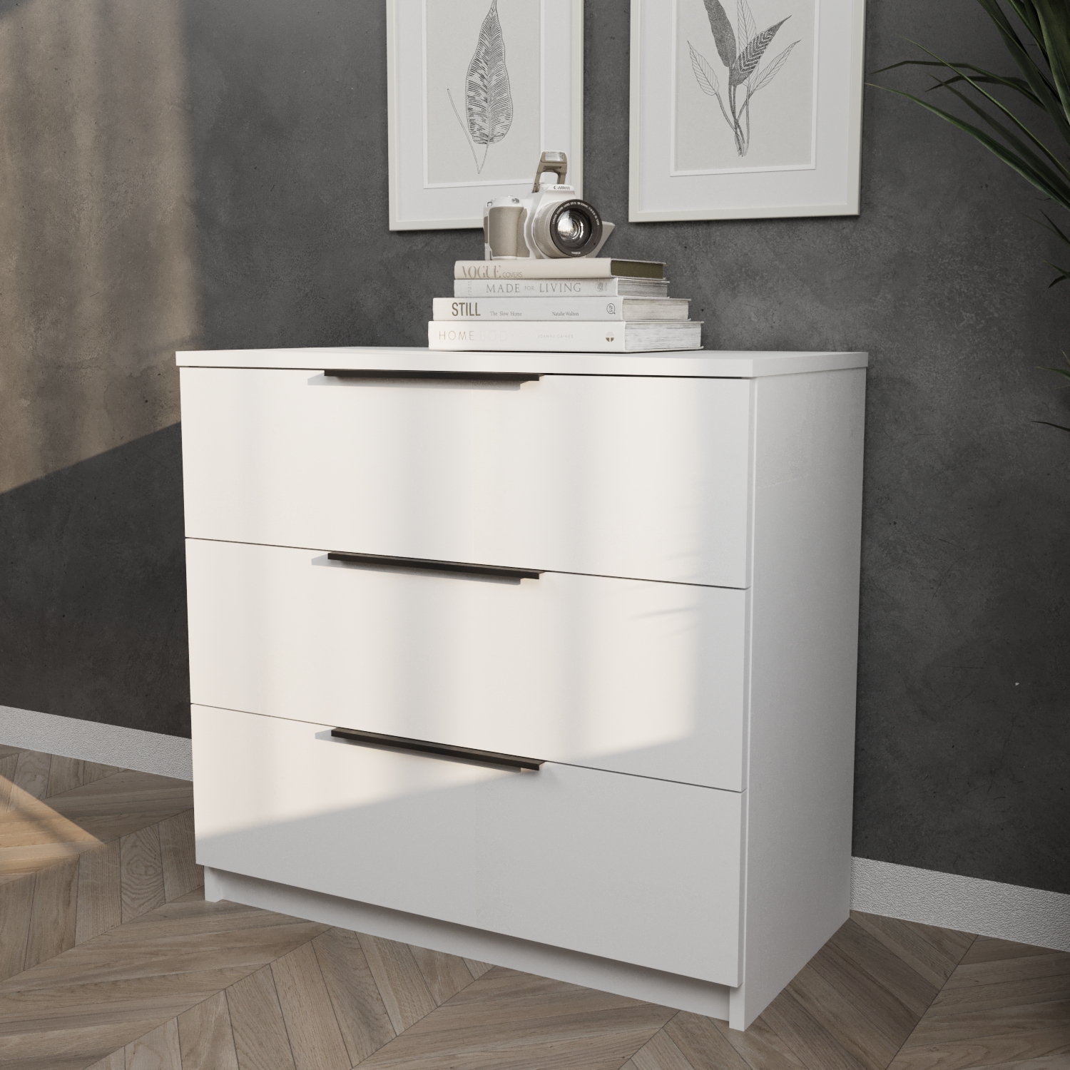 Цей компактний комод з ручками-профілями ідеально підійде для невеликих приміщень, де важливий кожен сантиметр простору. Його розміри (В/Ш/Г): 755/800/400 мм дозволяють розмістити його навіть у вузькому коридорі чи маленькій спальні. Ручки-профілі не лише надають комоду сучасного вигляду, а й забезпечують максимально можливу висоту шухляд, збільшуючи корисний простір для зберігання. Телескопічні направляючі повного висуву гарантують плавне та безшумне висування шухляд, а також дозволяють використовувати весь їх вміст.