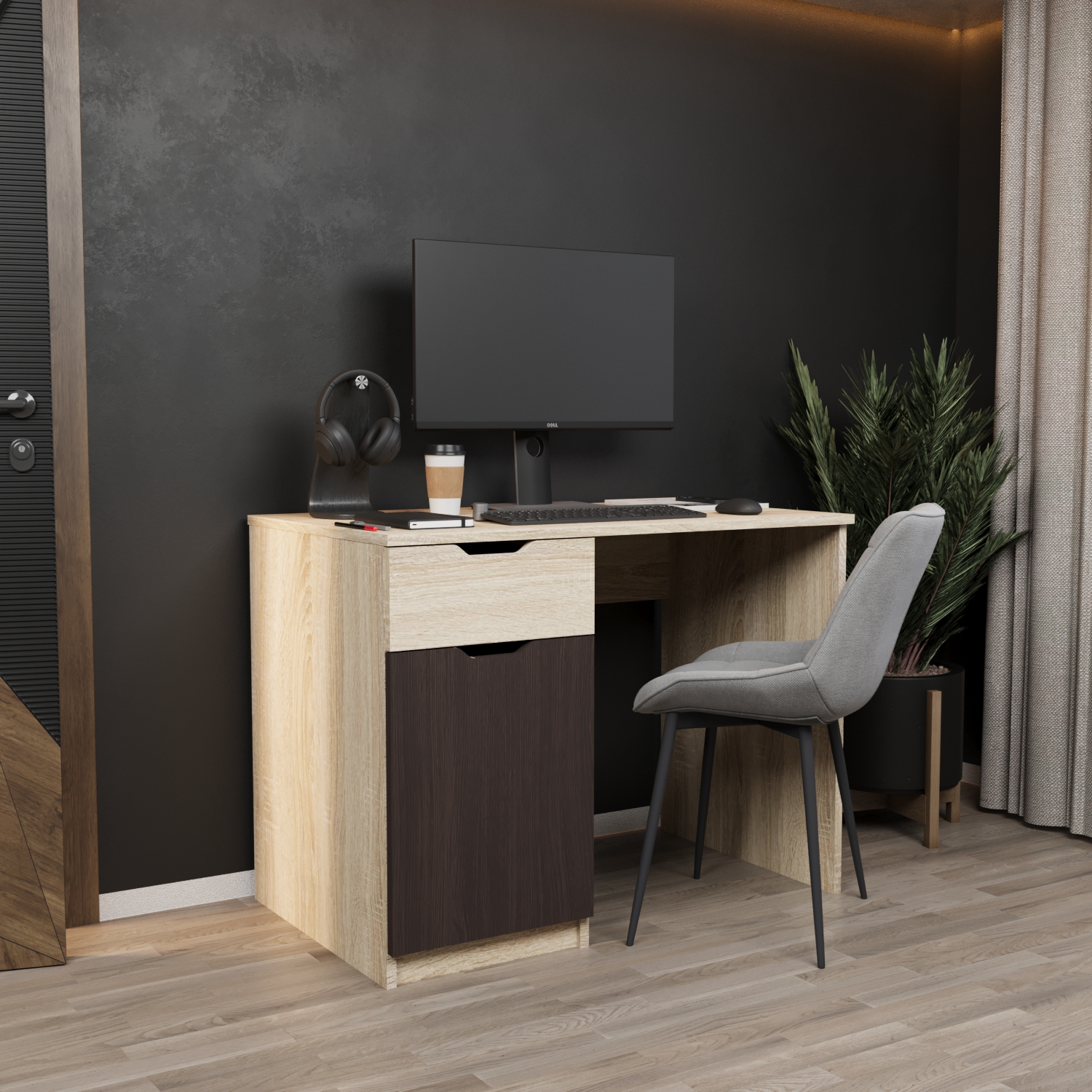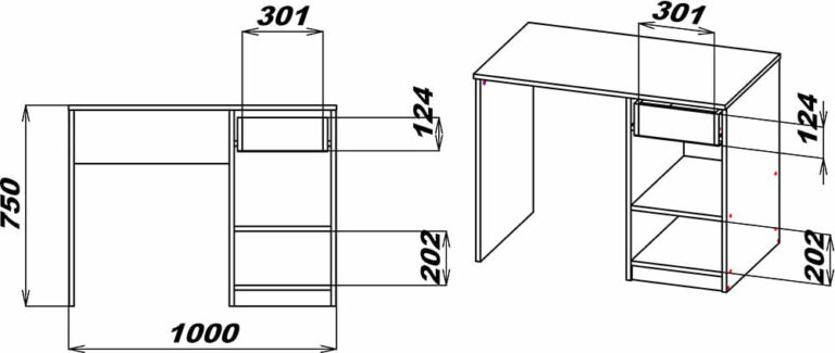 Стандартний стіл з секцією, що складається з шухляди та поличок за дверима. Ручки виконані у формі вирізів та забезпечують зручне відкривання без елементів що випирають