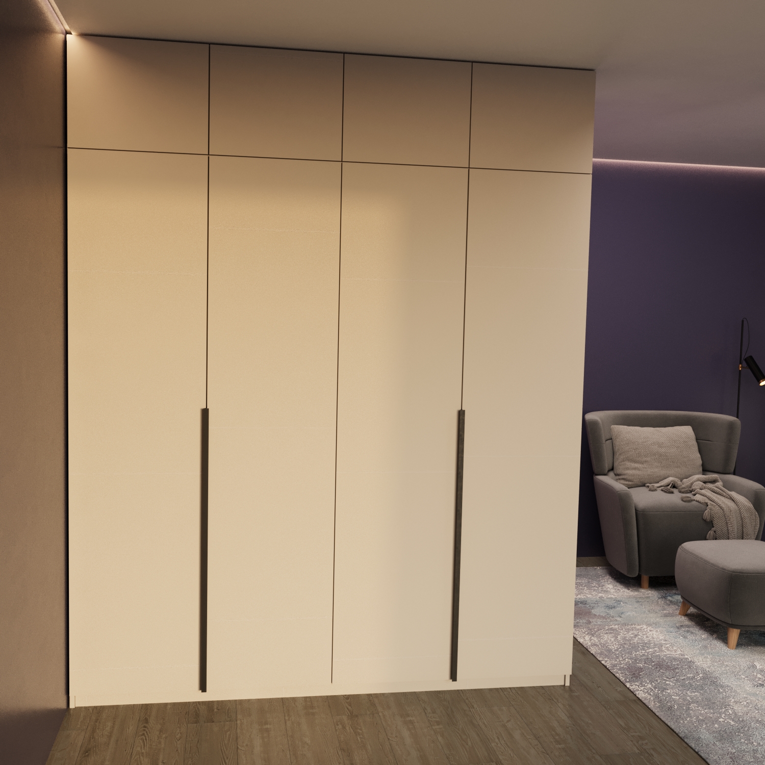 Шафа з закритими шухлядами, поличками, антресоллю з технологією відкриття від дотику, чотирма секціями зі штангами для одягу та стильними ручками профілями. Все це помістилось у шафі М-183. Змінюйте розміри, кольори ЛДСП та конструкцію виробу для забезпечення ще більшого комфорту та зручності у використанні.